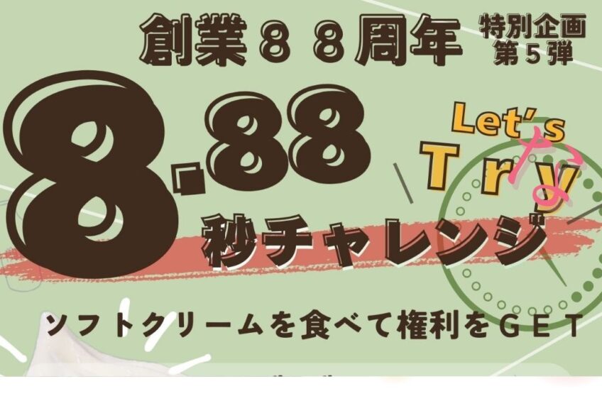 おかげ様で88周年 創業88周年特別企画第5弾 【 Let‘s Try!8.88秒チャレンジ 】 ルール ①ソフトクリーム購入でチャレンジ権をGET ②ストップウォッチを8.88秒でとめるだけ 景品 8....