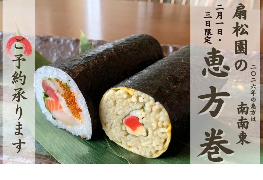 2026年の恵方は 南南東 想像以上に海の幸がぎっしり詰まった海鮮恵方巻 さっぱりヘルシーな扇松園特製お蕎麦の恵方巻 今年の福は 扇松園の恵方巻で丸かじり 引渡し日 2/1or2/3限定 金額 恵方巻2本セット(海...