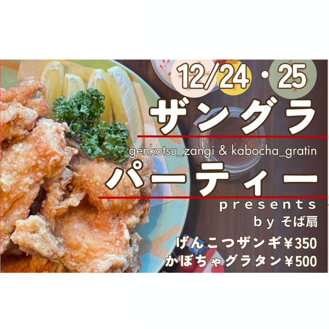 クリスマスはそば扇で【ザングラパーティー】 2025.12.18 Post 12月24日・25日は扇松園名物「げんこつザンギとかぼちゃグラタン」クリスマスを彩るのはいかがでしょう クリスマス特別価格 げんこつザンギ通常 ¥480 → ¥350!! かぼちゃグラタン通常 ¥650 → ¥500!! 他にも… この2日間だけ【料理長特製!クリスマスロールケーキ】 ¥750 予約受付中 ☆そば扇のクリスマス☆ 〇夜ご来店のお客様にホットチョコプレゼント 〇お子様にはお菓子プレゼント クリスマスはお家でも、そば扇でも扇松園でお腹も心も一杯にしませんか🎄 Post