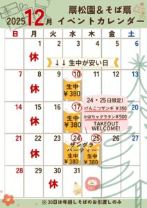 12月の瓦版 2025.12.17 Post 日頃の感謝を込めて そば扇にてビールを大変お得な価格で提供します 【中ジョッキ ¥380】 12月は10日・17日 さらに24日と25日のクリスマスは そば扇のザングラパーティーと併せて開催します! 美味しいビールをお得に 美味しいお料理をおつまみに 皆様のお越しをお待ちしています Post