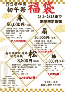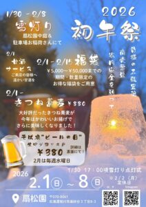 2026年の初午祭がはじまります 2026.01.30 Post 雪や氷のキャンドルが温かく彩る扇松園の夜 皆様の商売繫盛・五穀豊穣・家内安全を願って 2026年の初午祭を開催いたします 〇雪灯り 1月30日~2月8日 〇初午祭 2月1日~2月8日 〇福袋 2月1日~2月15日 〇きつね蕎麦 2月1日~ 〇甘 酒 2月1日 皆様のお越しを心よりお待ちしております Post