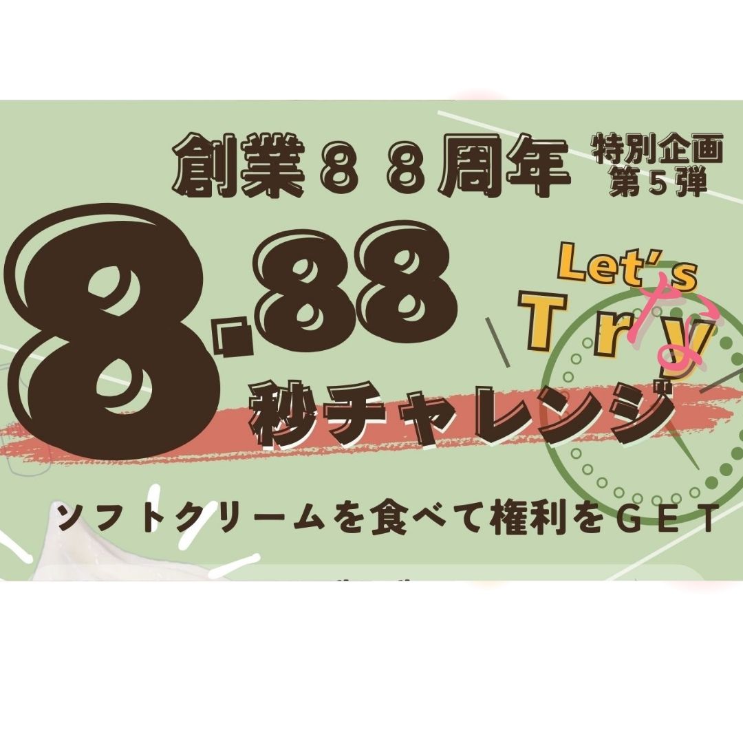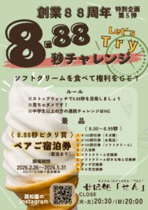 Let‘s Try! 8.88秒チャレンジ 2026.03.03 Post おかげ様で88周年 創業88周年特別企画第5弾 【 Let‘s Try!8.88秒チャレンジ 】 ルール ①ソフトクリーム購入でチャレンジ権をGET ②ストップウォッチを8.88秒でとめるだけ 景品 8.88秒ピタリ賞 ご宿泊券/素泊り2名様 8.00~8.99秒 くじ引きで景品と交換 ※景品・期間につきましては下記をご参照ください 皆様のご参加お待ちしてます! Post